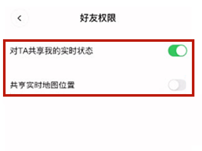 2、将对TA共享我的实时状态和共享实时地图位置的右侧开关关闭即可。