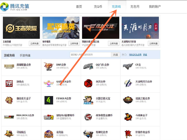 1、在腾讯充值网站点击充游戏。