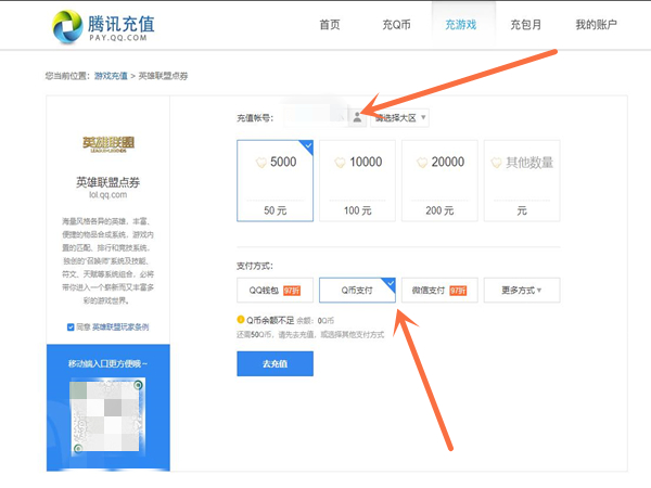 2、选择需要充值的账号,点击Q币支付,再进行支付即可。