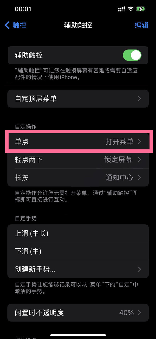 3、开启【辅助触控】开关,选择操作方式以及功能即可。
