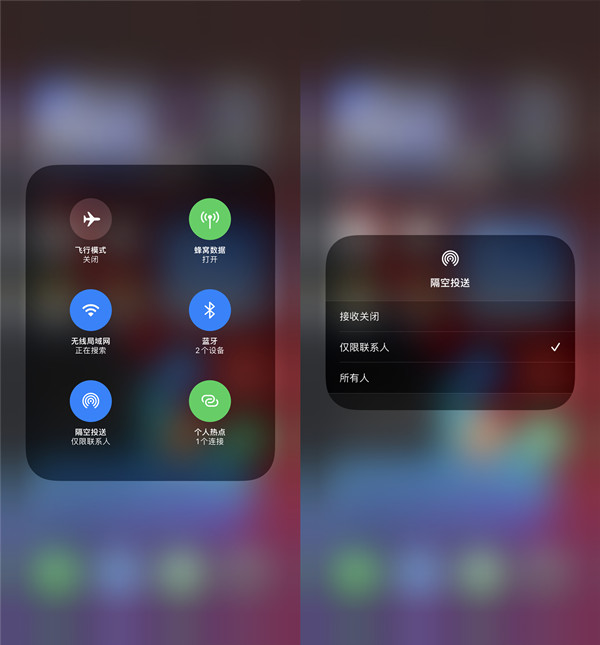 接收对象只需要点击接受即可。若不想发送给周围的人,可以长按控制中心蓝牙图标,点击隔空投送,设定隔空投送的联系人。