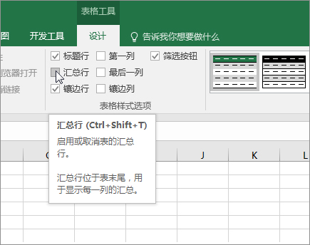 1、单击表格任意位置,点击表格工具>设计>汇总行。