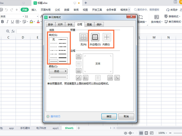 2、点击边框,选择外边框或内部,在样式一栏,选择线条的粗细并点击确定即可。