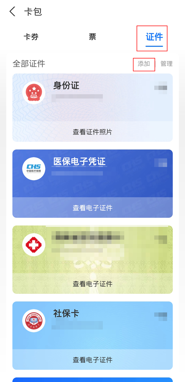 1、打开支付宝,点击卡包>证件,点击【添加】。