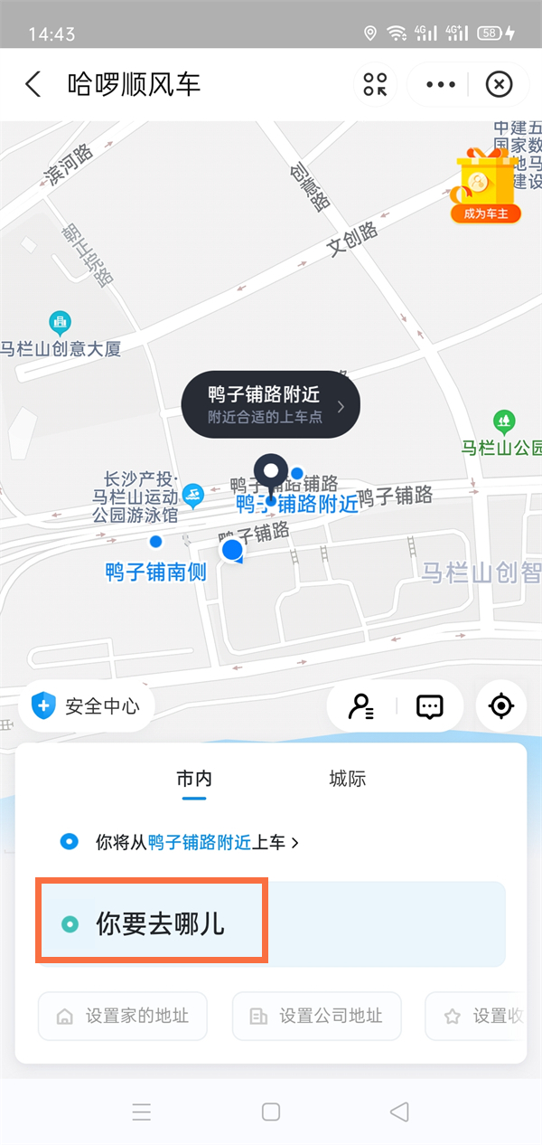 1、支付宝搜索并进入哈罗顺风车页面后,点击你要去哪儿。