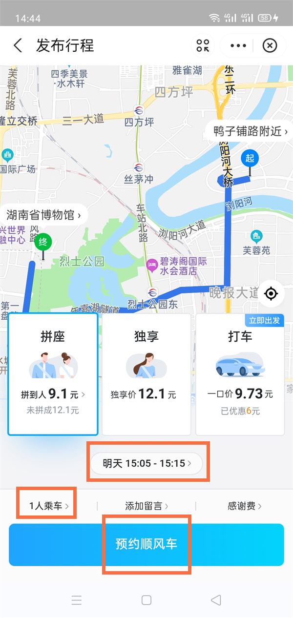 3、设置好预约时间、乘车人数等信息后,点击预约顺风车即可。