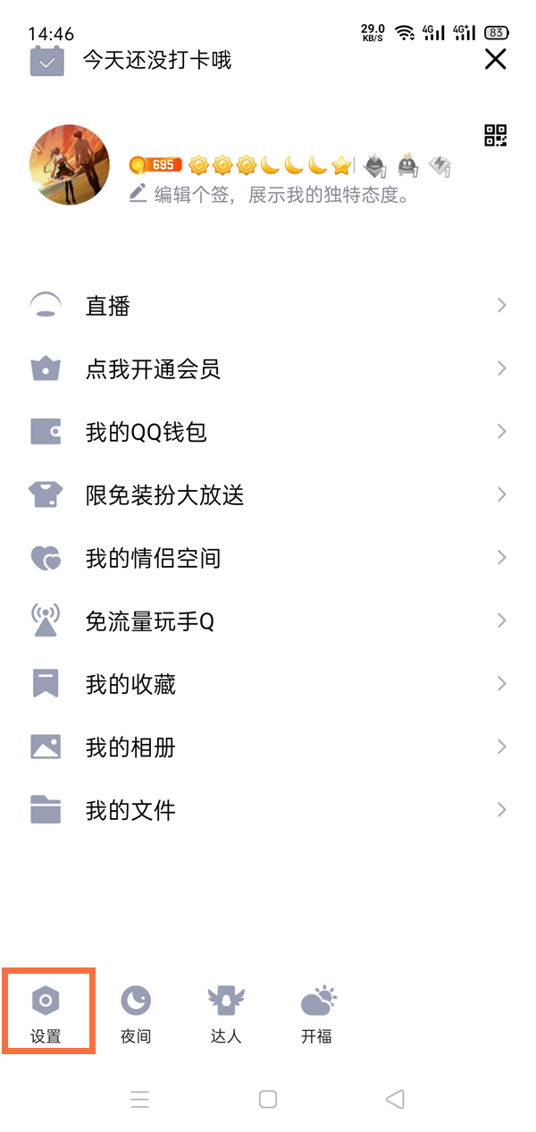 1、打开QQ,点击个人头像后,点击设置。