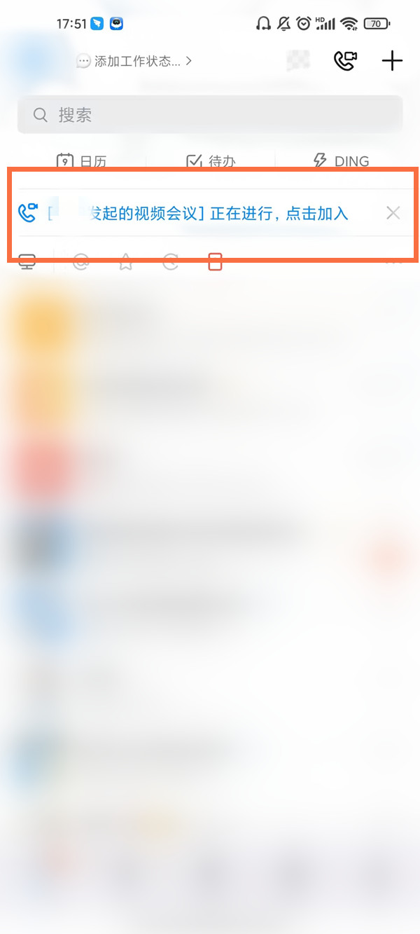 1、打开钉钉app,在消息页面顶部,点击“正在进行会议,点击加入”。
