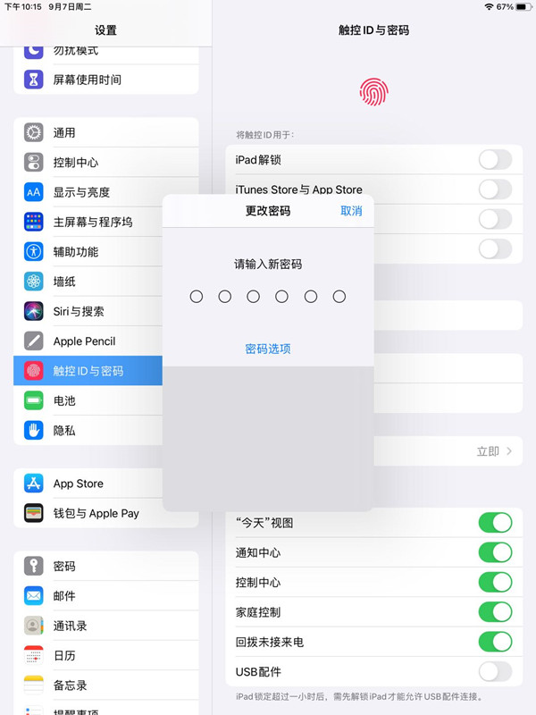 1、在平板设置中点击【触控ID与密码】,输入旧的密码。