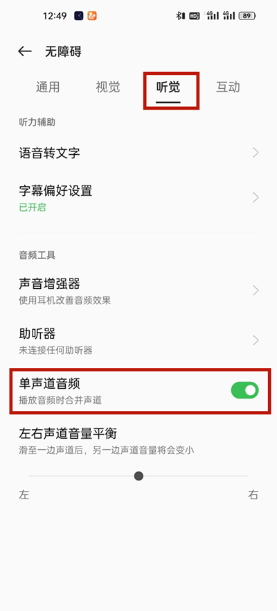 3、点击【听觉】,将【单声道音频】右侧开关关闭即可。