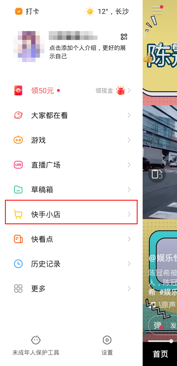 1、打开快手app,点击左上角三横图标,点击【快手小店】。