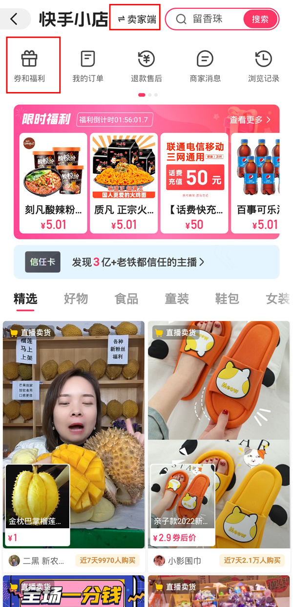 2、点击快手小店后方的转换图标,切换至【卖家端】,点击【券和福利】。