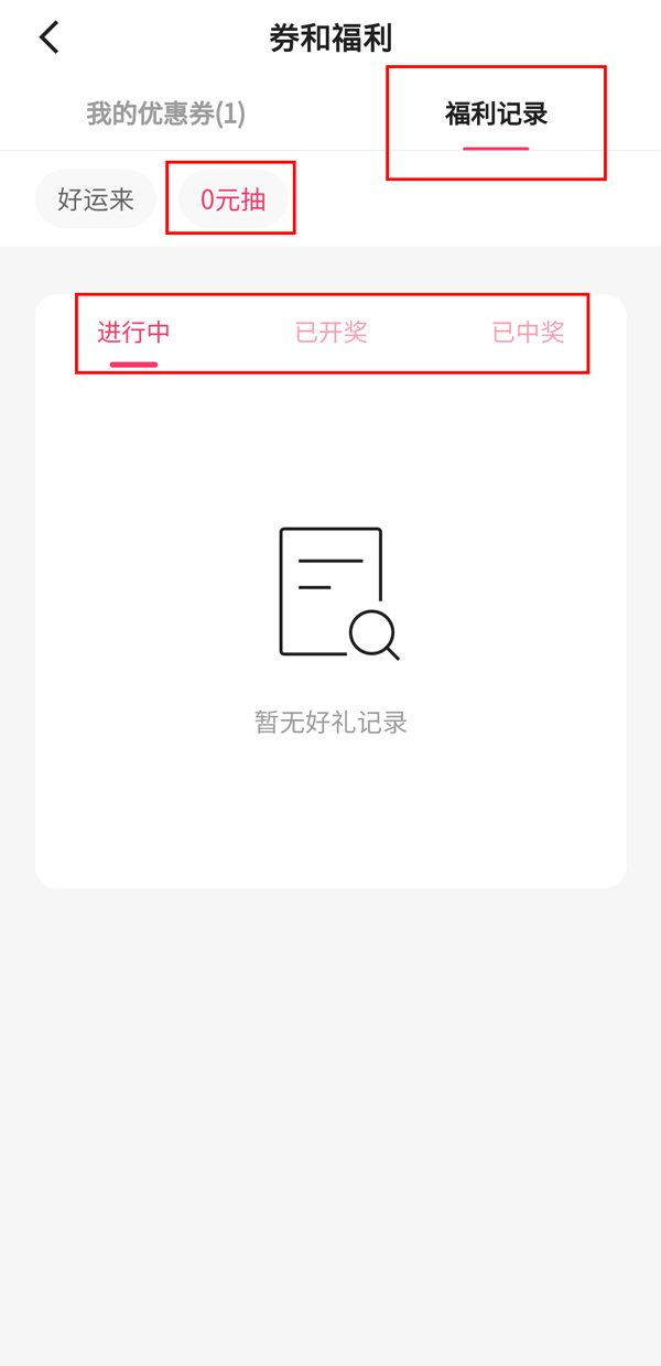 3、点击【福利记录】,点击【0元抽】,即可看到自己中奖了没。