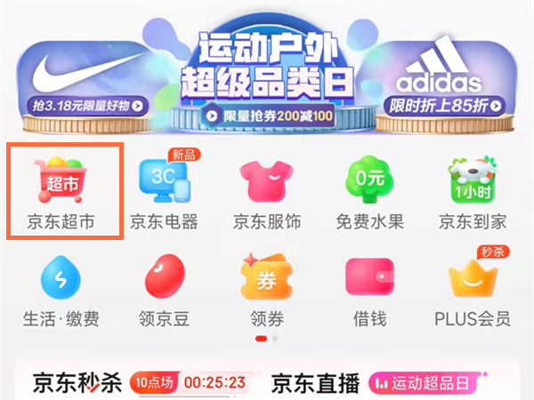 1、打开京东app,在首页点击京东超市。