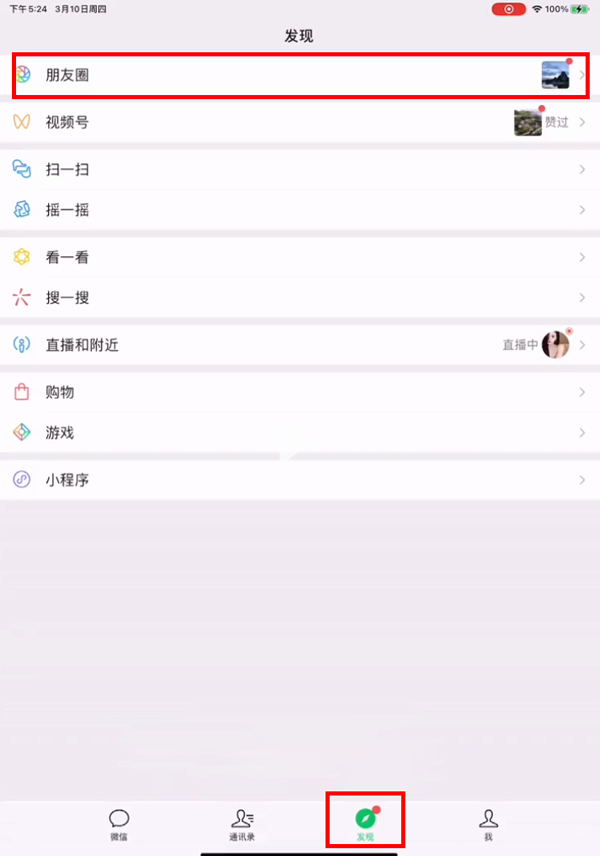 1、用ipad登录微信,点击【发现】,点击【朋友圈】。