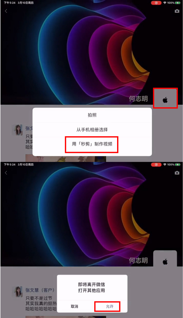 2、点击apple图标,点击【用秒剪制作视频】,点击【允许】。