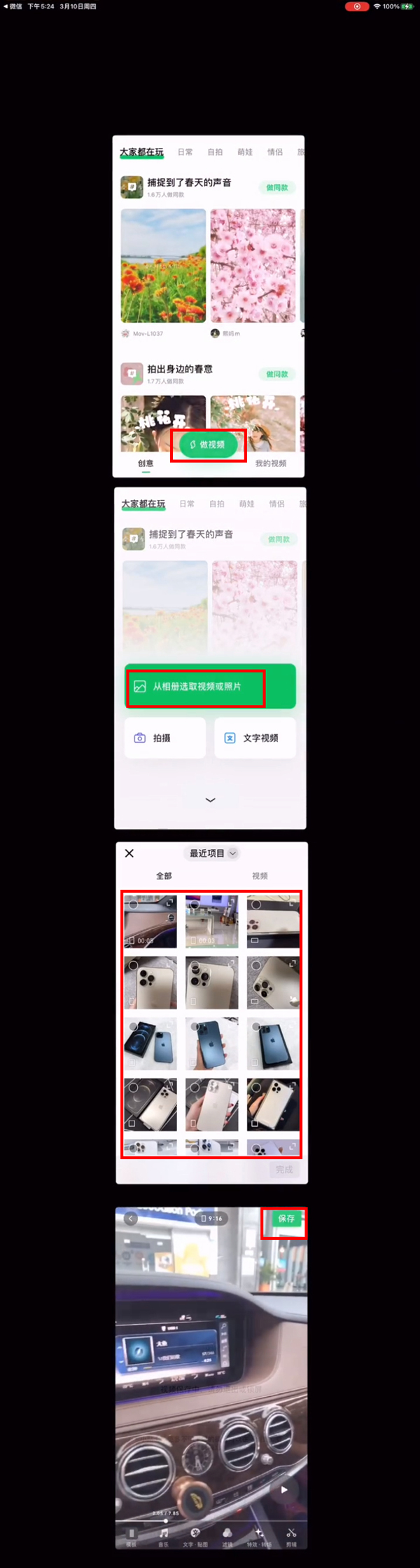 3、点击【做视频】,点击【从相册选取视频或照片】,选择视频,点击【保存】。