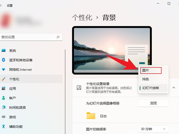 3、在“个性化设置背景”中选择【图片】并选择一张图片即可。