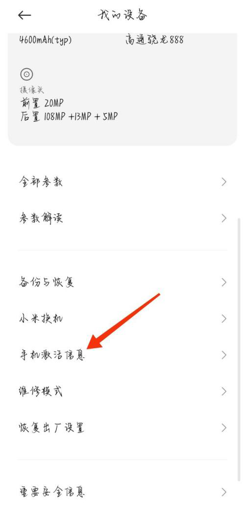 2、下拉找到并点击【手机激活信息】选项。