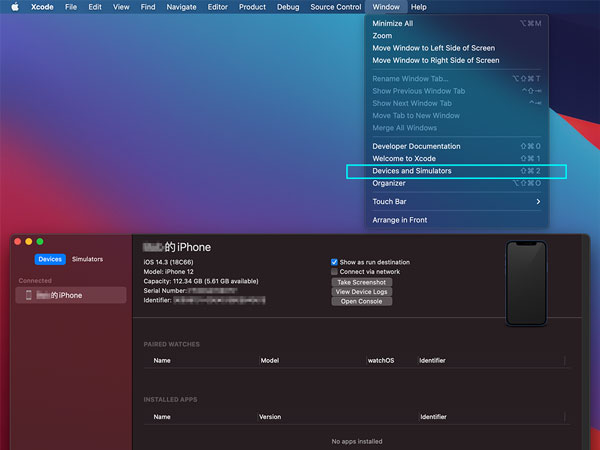 2、打开【Xcode】,找到“Window”里的“Devices and Simulators”并点击,在弹出的页面里选择你的手机。