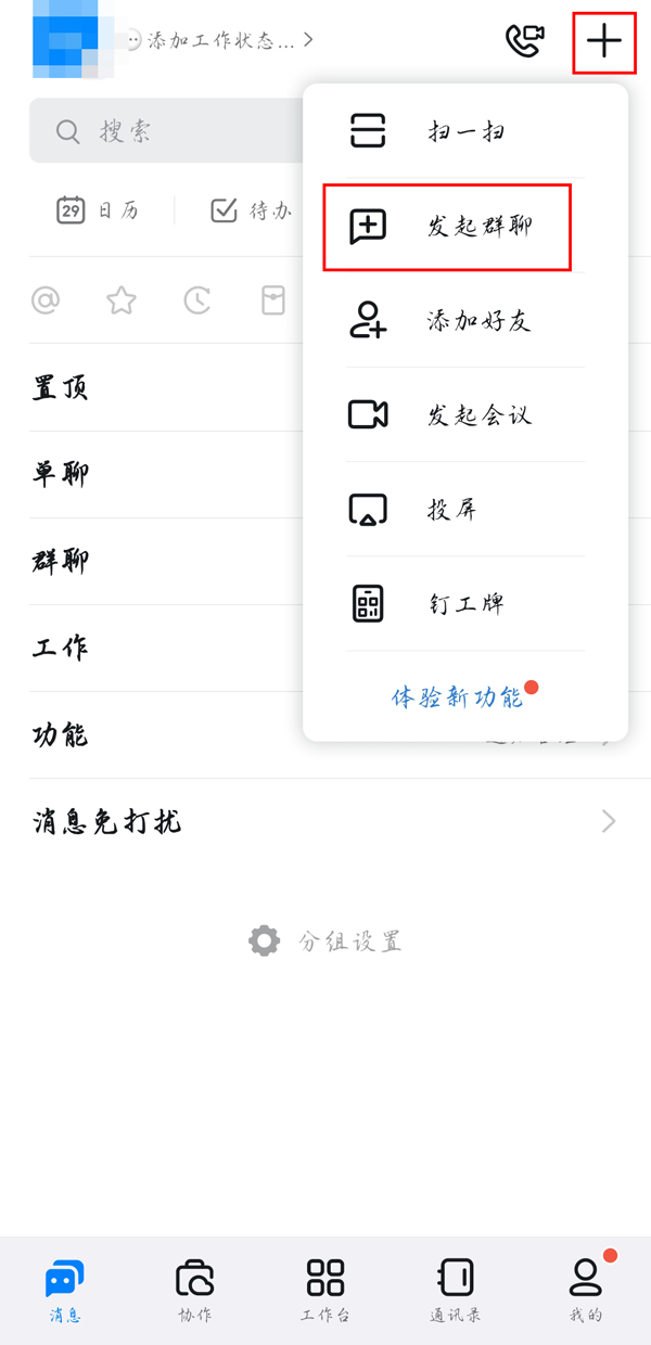 1、打开钉钉,点击右上角的【+】,点击【发起群聊】。