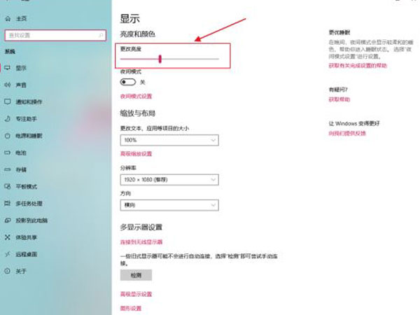 在设置页面点击系统,点击显示,在亮度和颜色下左右滑动更改亮度的滑块即可。