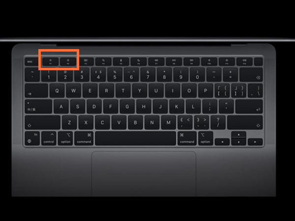 在Mac键盘上找到亮度键F1和F2,按F1是降低屏幕亮度,按F2是增加屏幕亮度,根据需要设置的亮度进行调节。