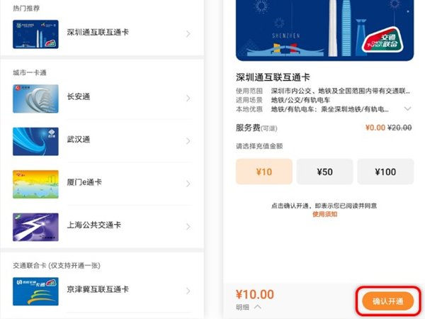 2、选择需要开通的公交卡,再选择充值金额并付款即可开通使用。