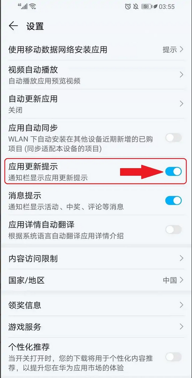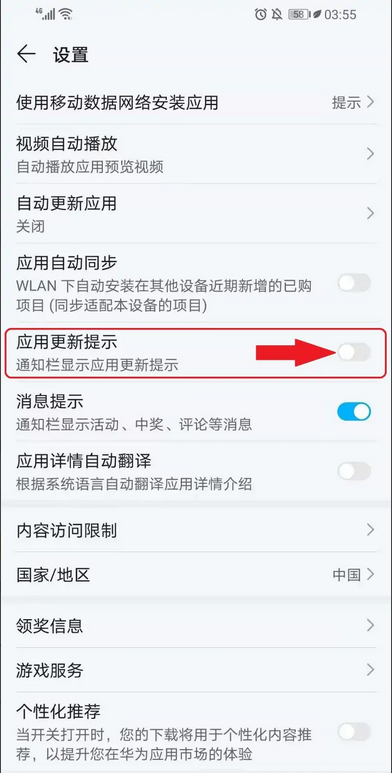 第四步:关闭“应用更新提示”右侧的开关,即可关闭华为应用市场更新提示。