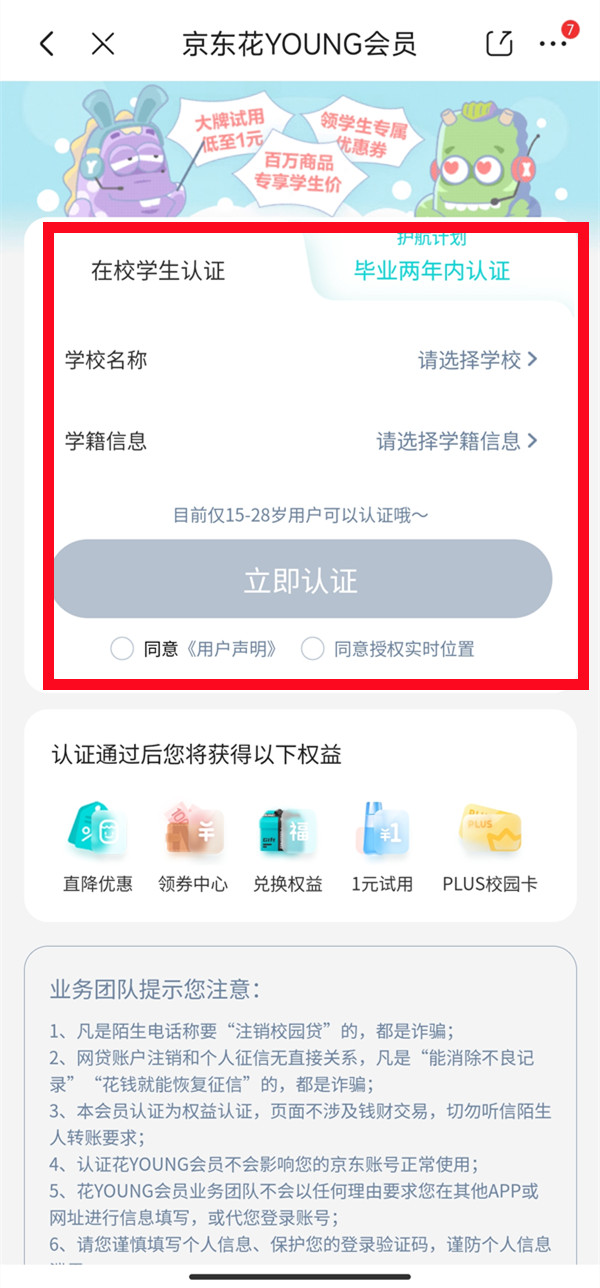 1、在京东APP首页搜索栏输入"学生认证",进到京东花young会员页面。