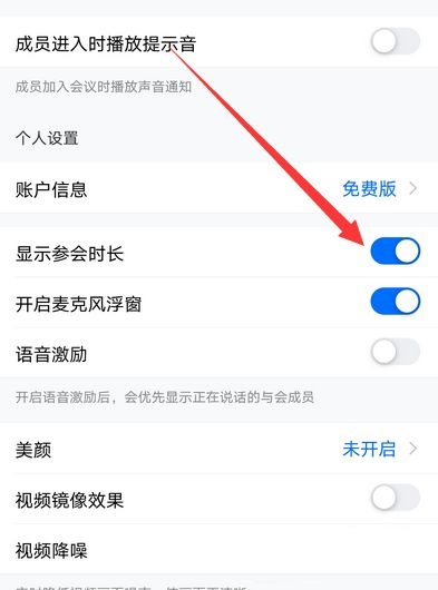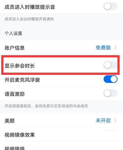第四步:进入设置页面下面位置打开【显示参会时长】(如图所示)。
