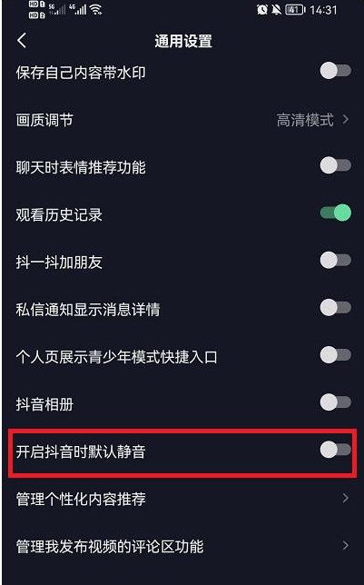 4、最后就可以在该功能界面中的下方找到【开启抖音时默认静音】点击打开就可以设置为静音。