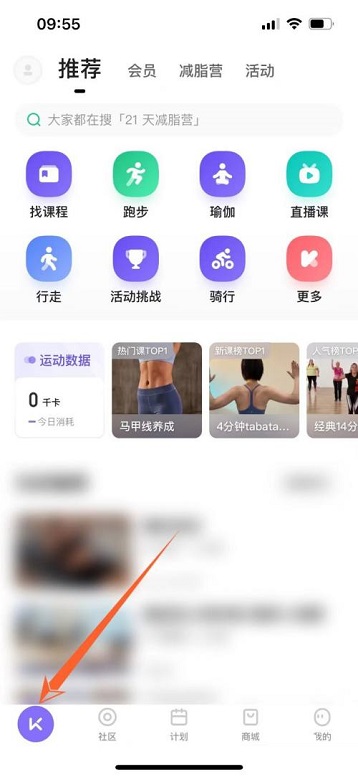 第一步:打开keep进入主页面后,点击左下方【K】(如图所示)。