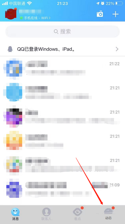 第一步:在手机QQ页面中,点击动态。