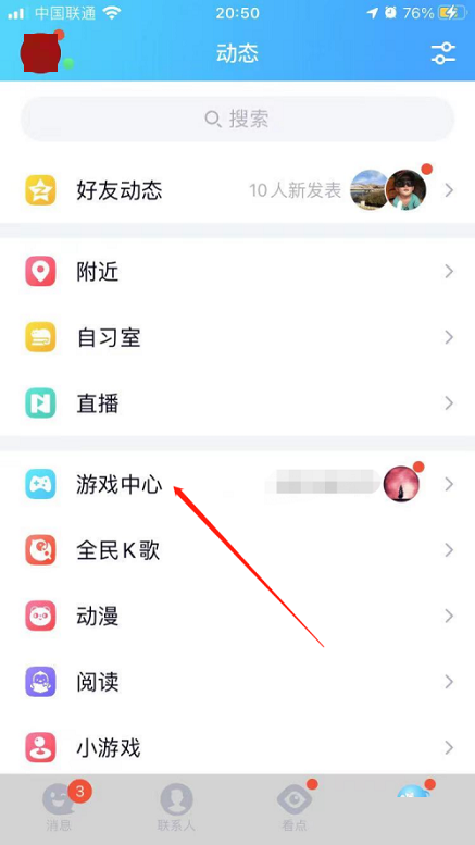 第二步:在动态页面中,点击游戏中心。