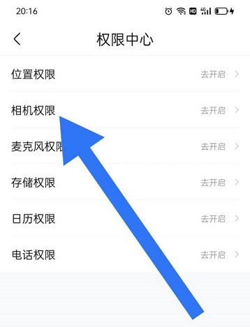 第五步:在“权限中心”页面,点击“相机权限”,开启即可(如图所示)。