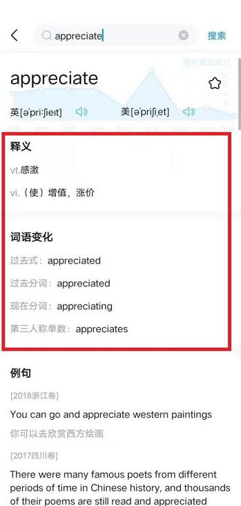 第四步:查询得到该单词的中文意思和词组变化(如图所示)。