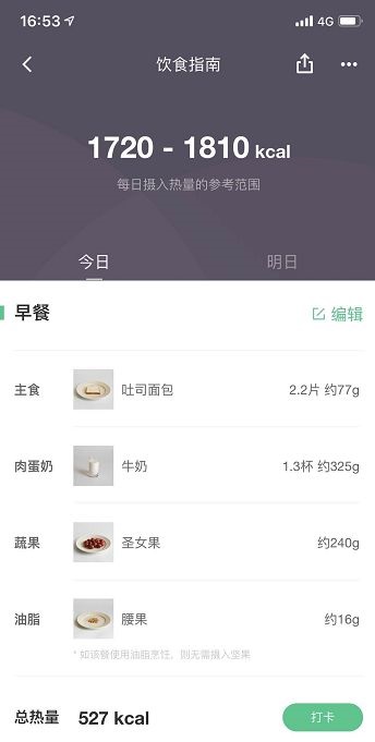第五步:开启后,就可以看到keep提供的饮食指南清单了(如图所示)。
