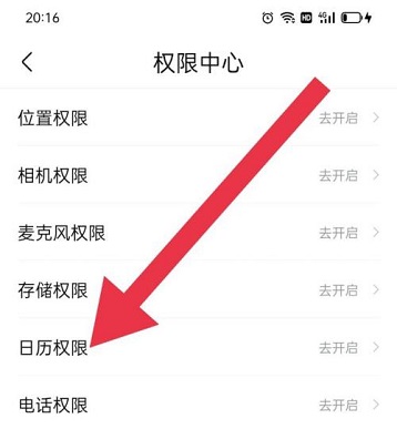 第五步:在“权限中心”页面,点击“日历权限”,开启即可(如图所示)。