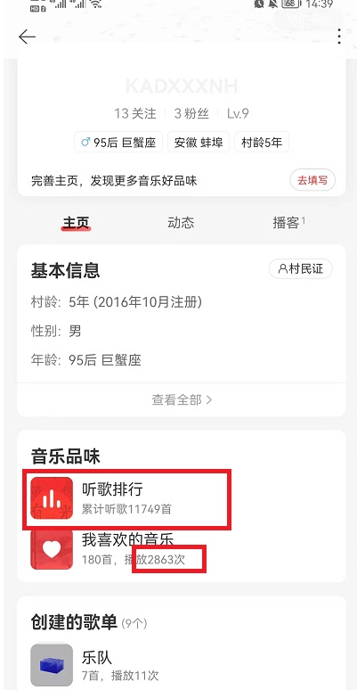 3、在自己的资料界面就可以看到自己的听歌次数,不同的歌单都会有不同的次数,还有具体的听歌数量。