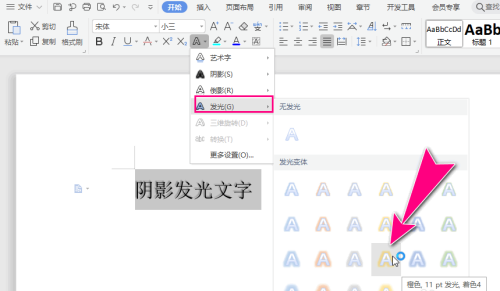 第五步:再选中阴影效果的文本内容,选择"发光"菜单,从中选择一款发光模板。