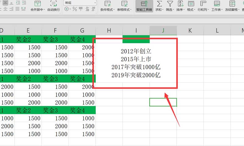 2、接着我们选中前五行合并单元格,并在单元格中输入文字内容文字内容为按照大事件时间轴的事件。