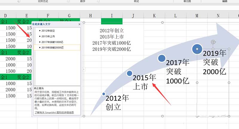 5、插入smartart向上箭头之后,我们可以看到就出现了一个大事件的时间轴。