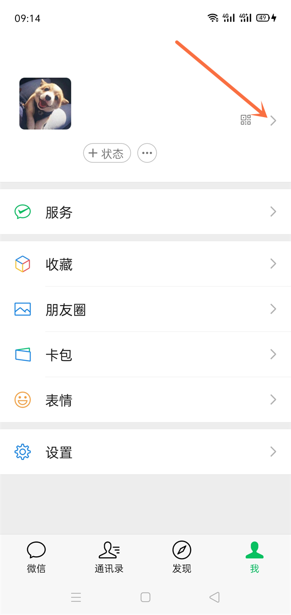 1、打开微信,点击我,点击头像右侧箭头图标。