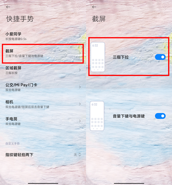 2、点击截屏,打开三指下拉右侧的开关,在需要截屏的页面三指下滑即可快速截屏。