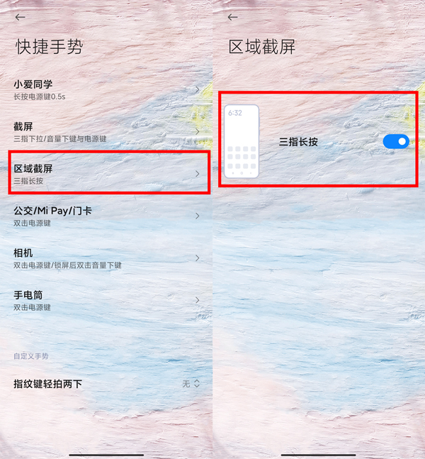 方法四、区域截屏:点击手机设置-更多设置-快捷手势-区域截屏,打开三指长按右侧的开关。