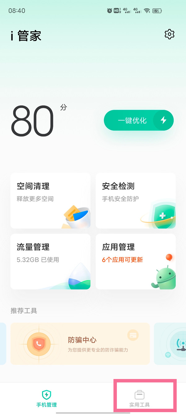 1、打开手机i管家应用图标,点击底部的【实用工具】。