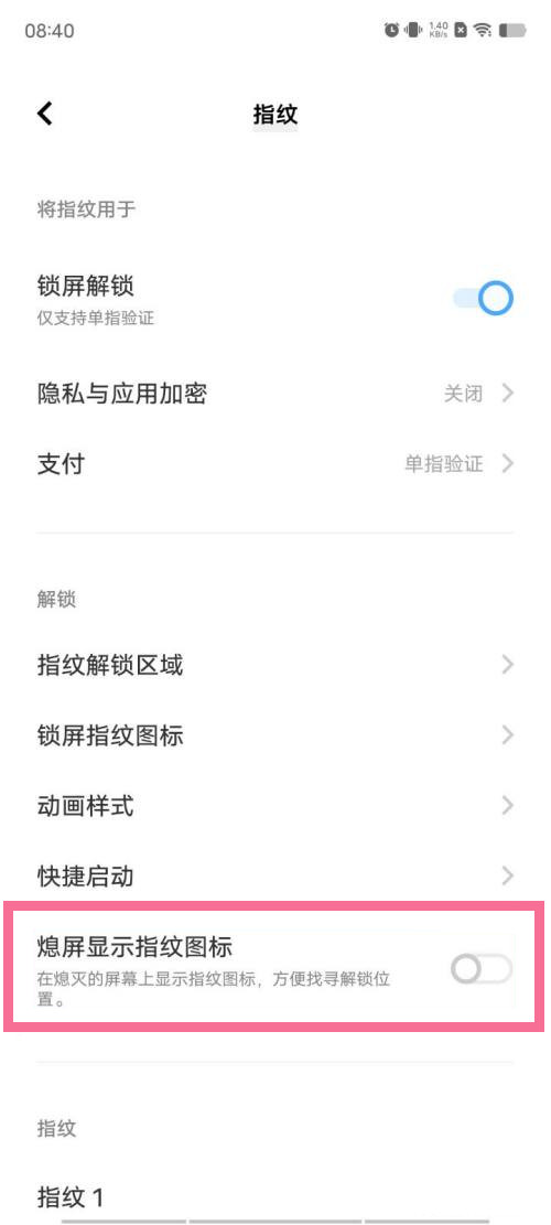 3、关闭【熄屏显示指纹图标】右侧的开关。