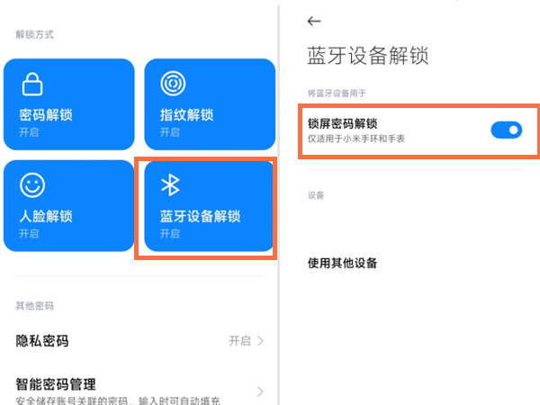 2、点击蓝牙设备解锁,将锁屏密码解锁的开关关闭即可。