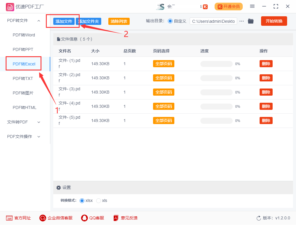 步骤2,进入内页后先选择【PDF转excel】功能;然后点击左上角【添加文件】蓝色按钮,将需要格式转换的pdf文件添加到软件中,支持批量转换节省时间。